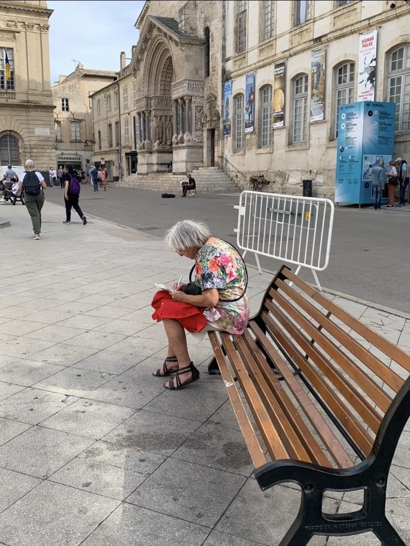 J’ai choisi de prendre cette photo parce qu’elle m’a paru à la fois intéressante et porteuse d’un message qui est la solitude mais que la dame semble apprécier. Ce que j’aime aussi, c’est que la personne photographiée ignorait que je la capturais sur le moment, elle n’a donc pas eu besoin de poser ou se mettre en valeur, ce qui rend ses gestes et son attitude authentiques et naturels.